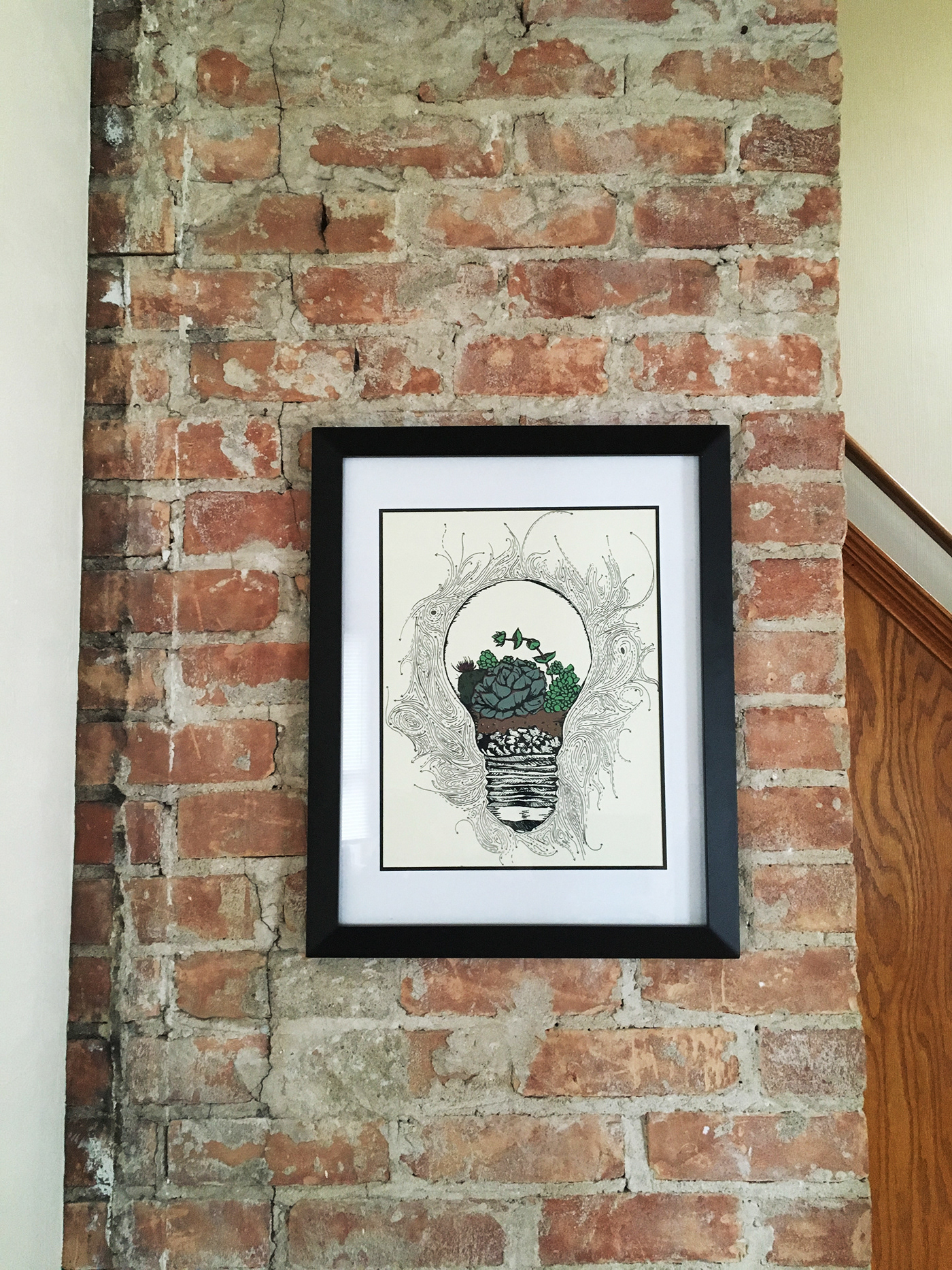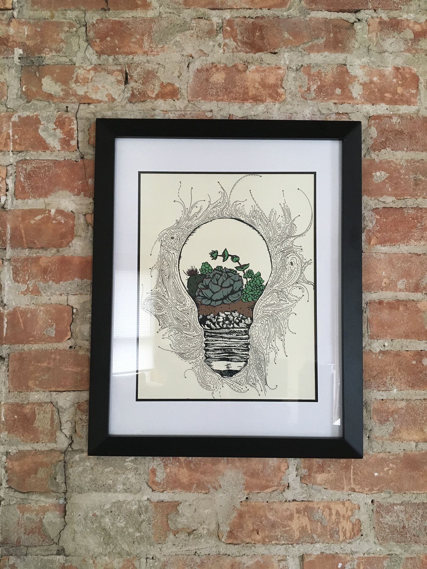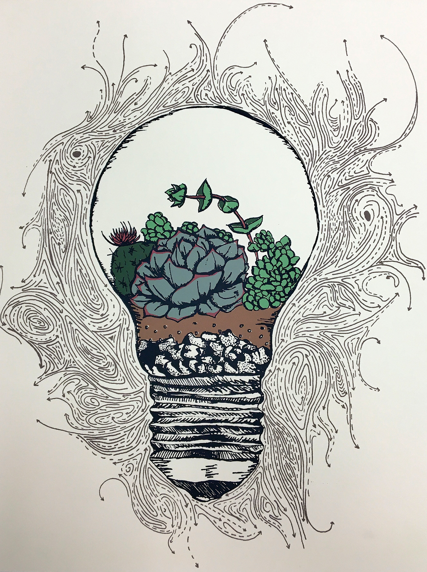 A screenprint project featuring succulents in a light bulb terrarium and detailed line work.