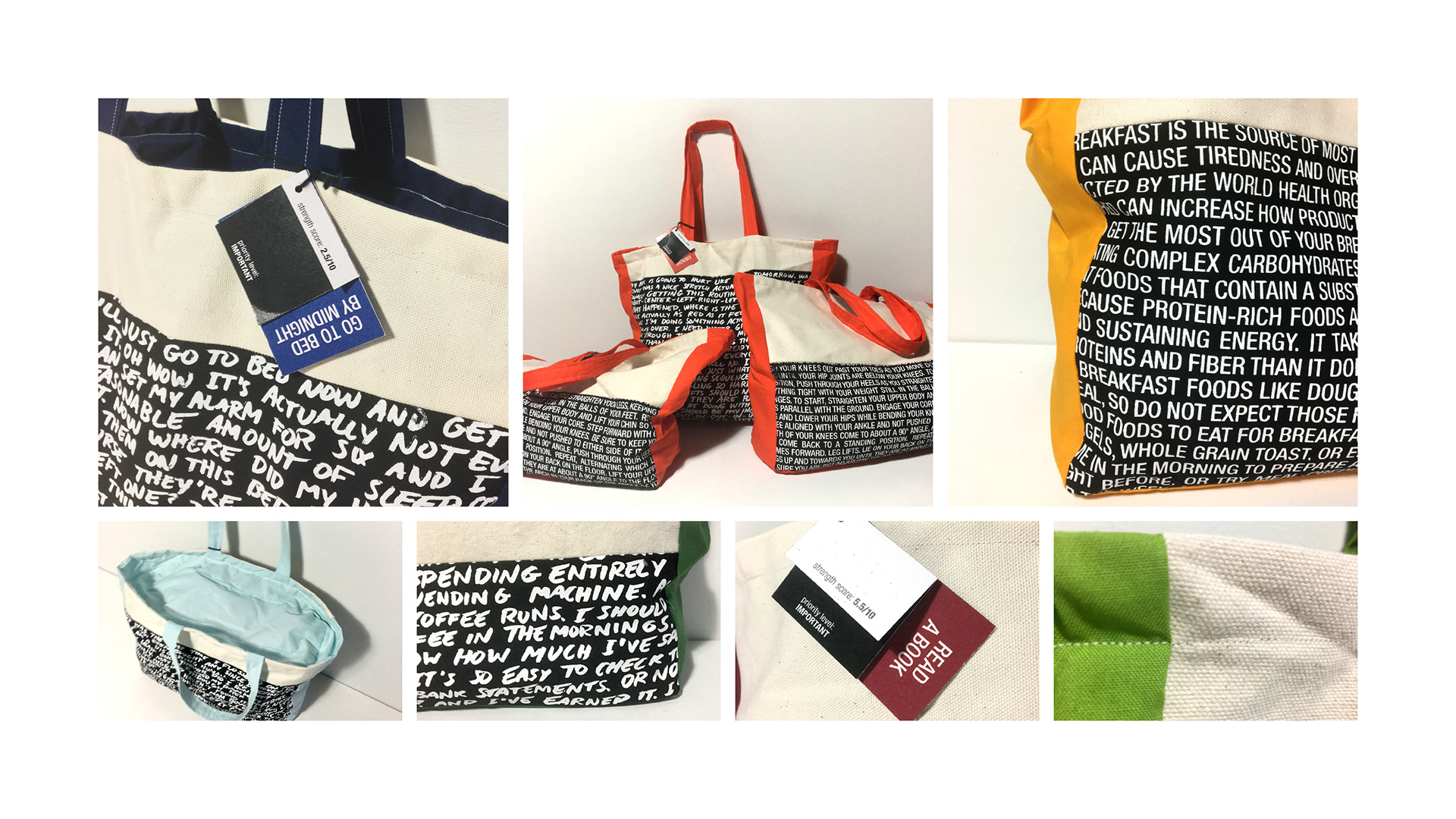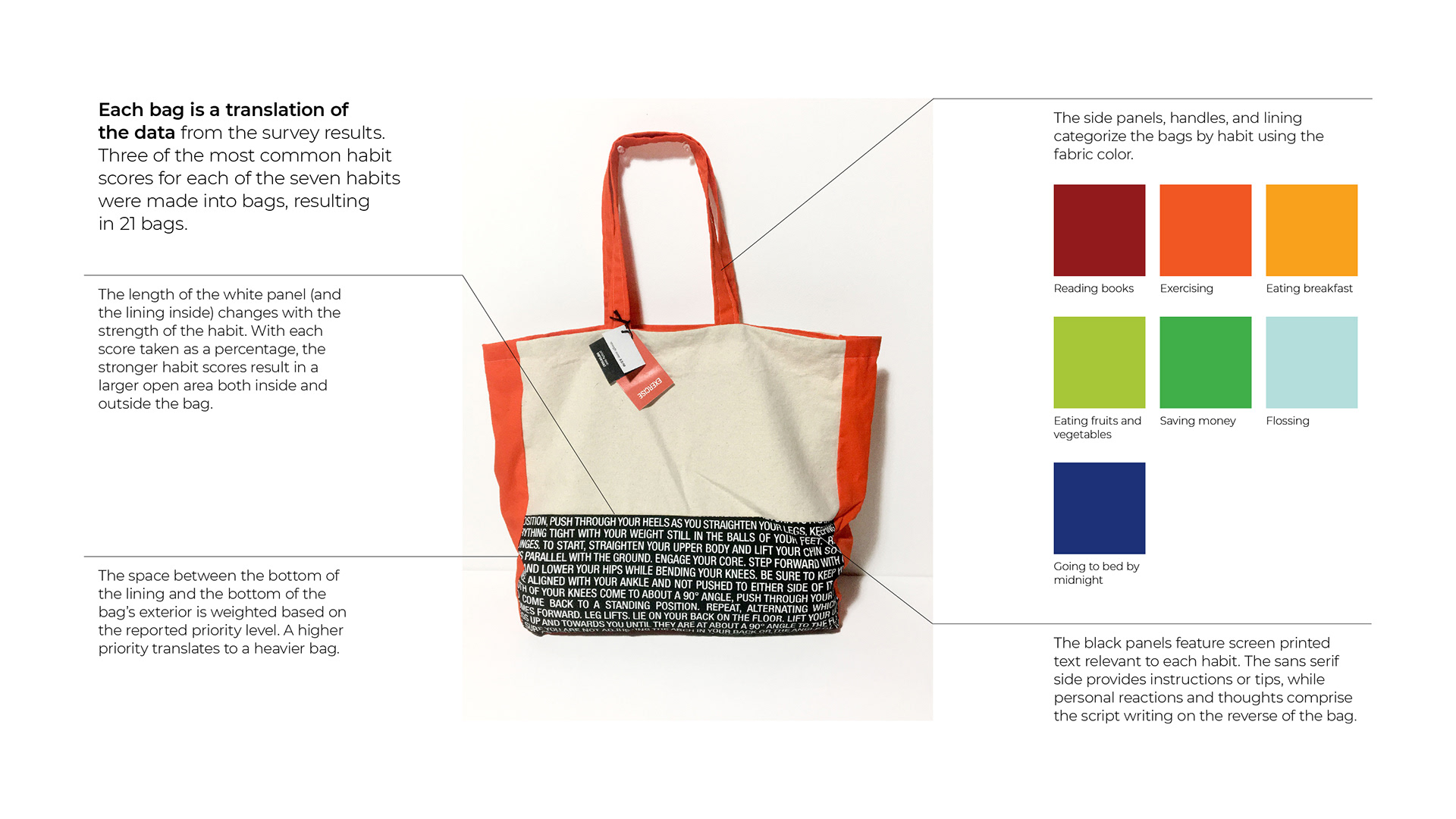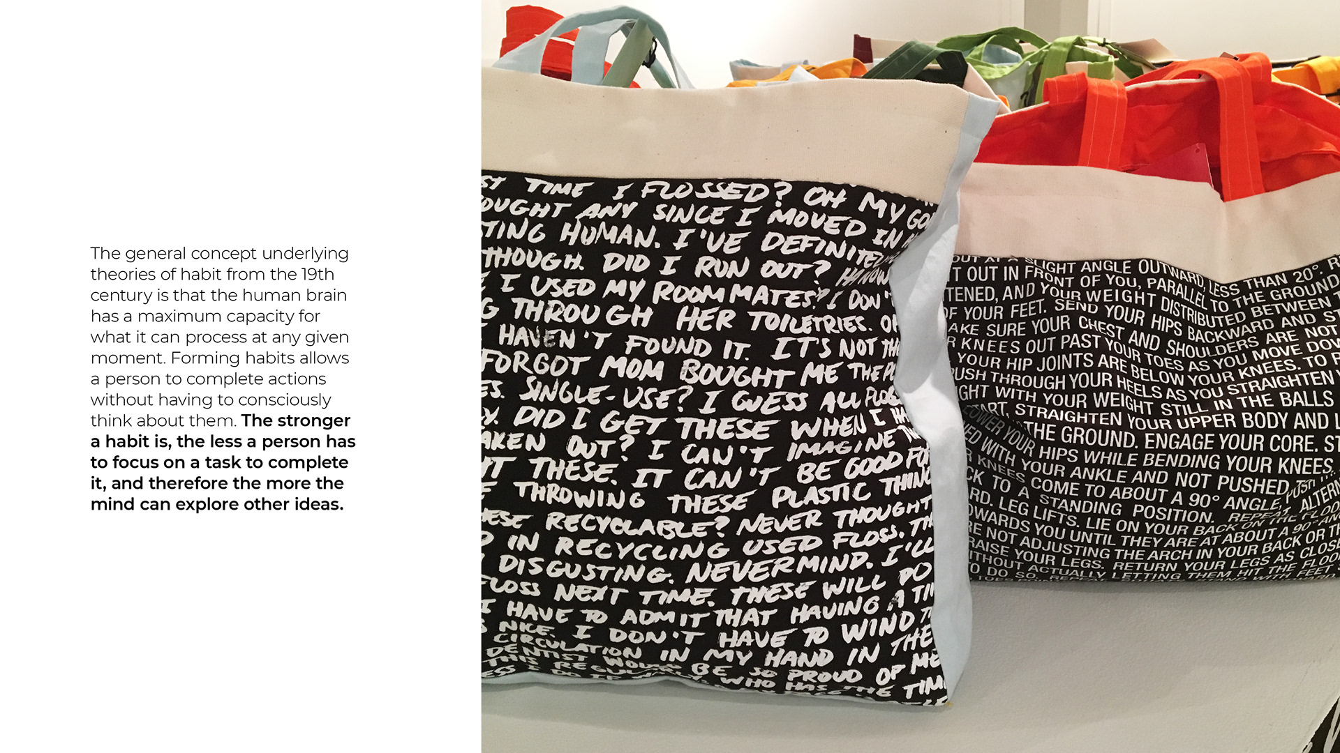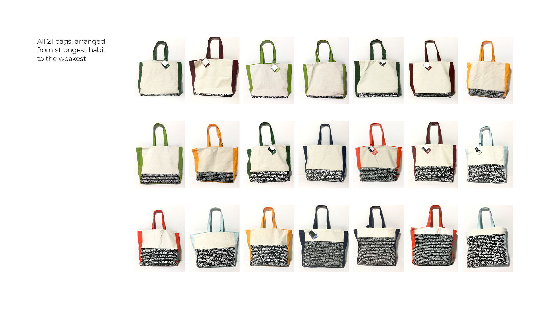 21 silk screened tote bags that illustrate the relationship between habit strength and mental capacity through changes in weight, available space, and outward appearance.