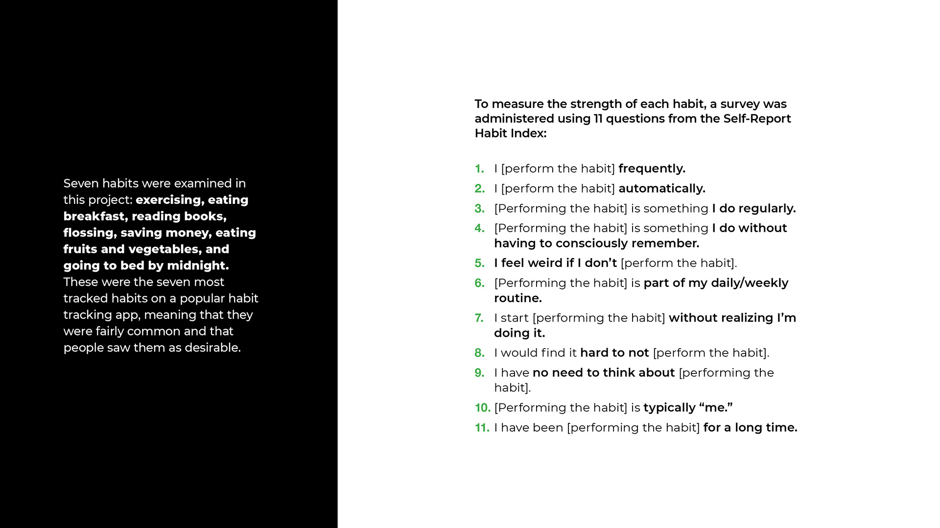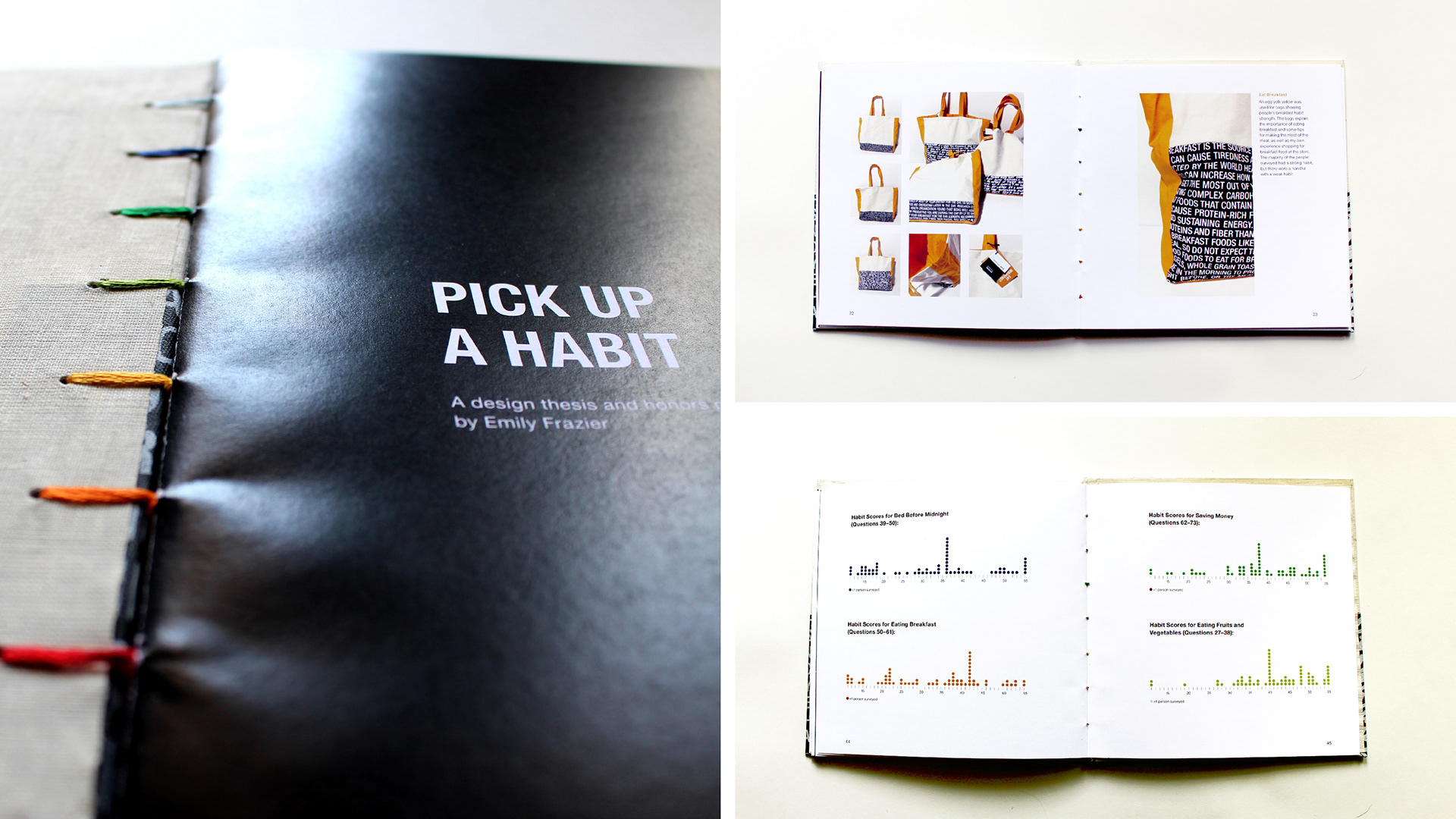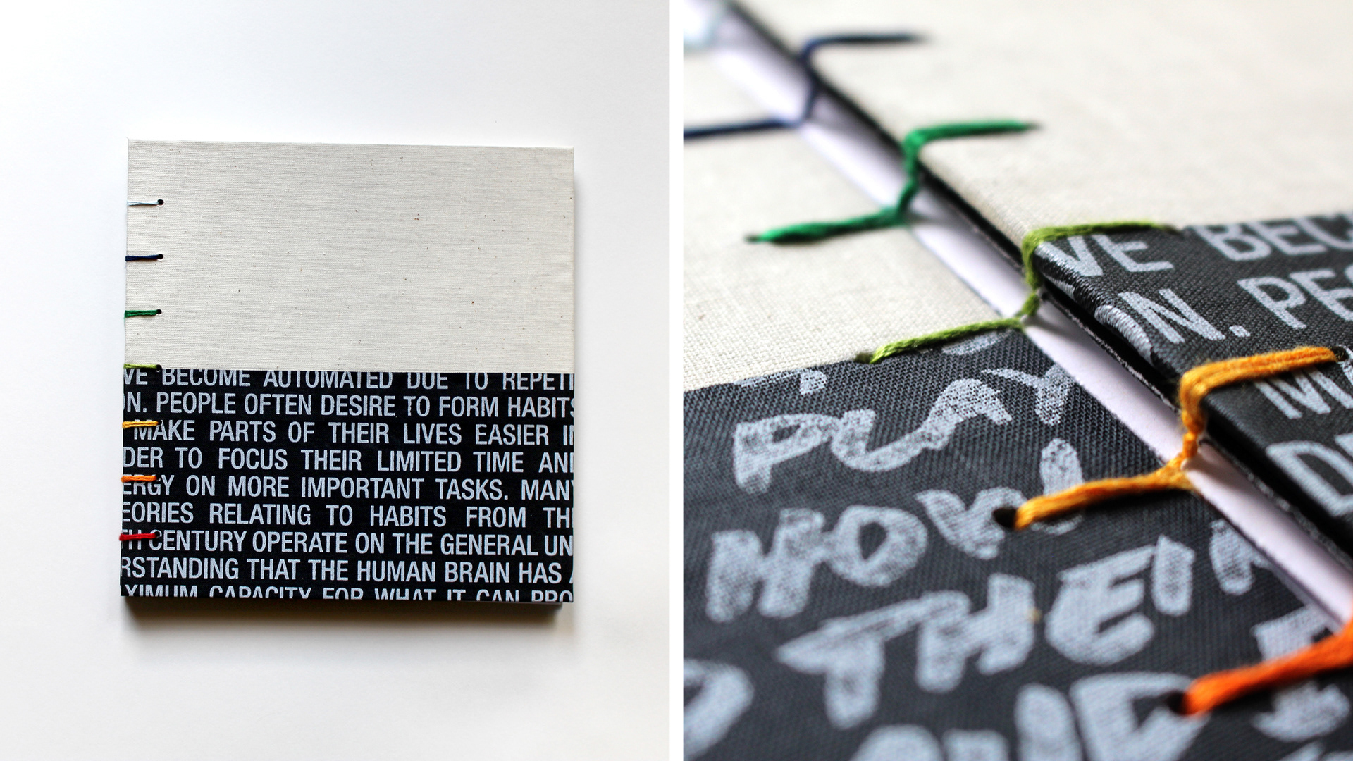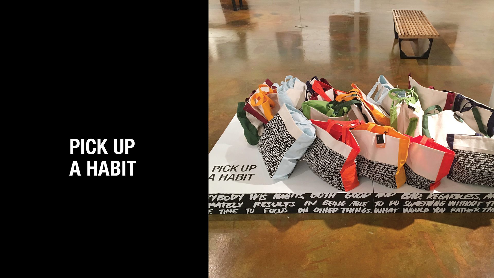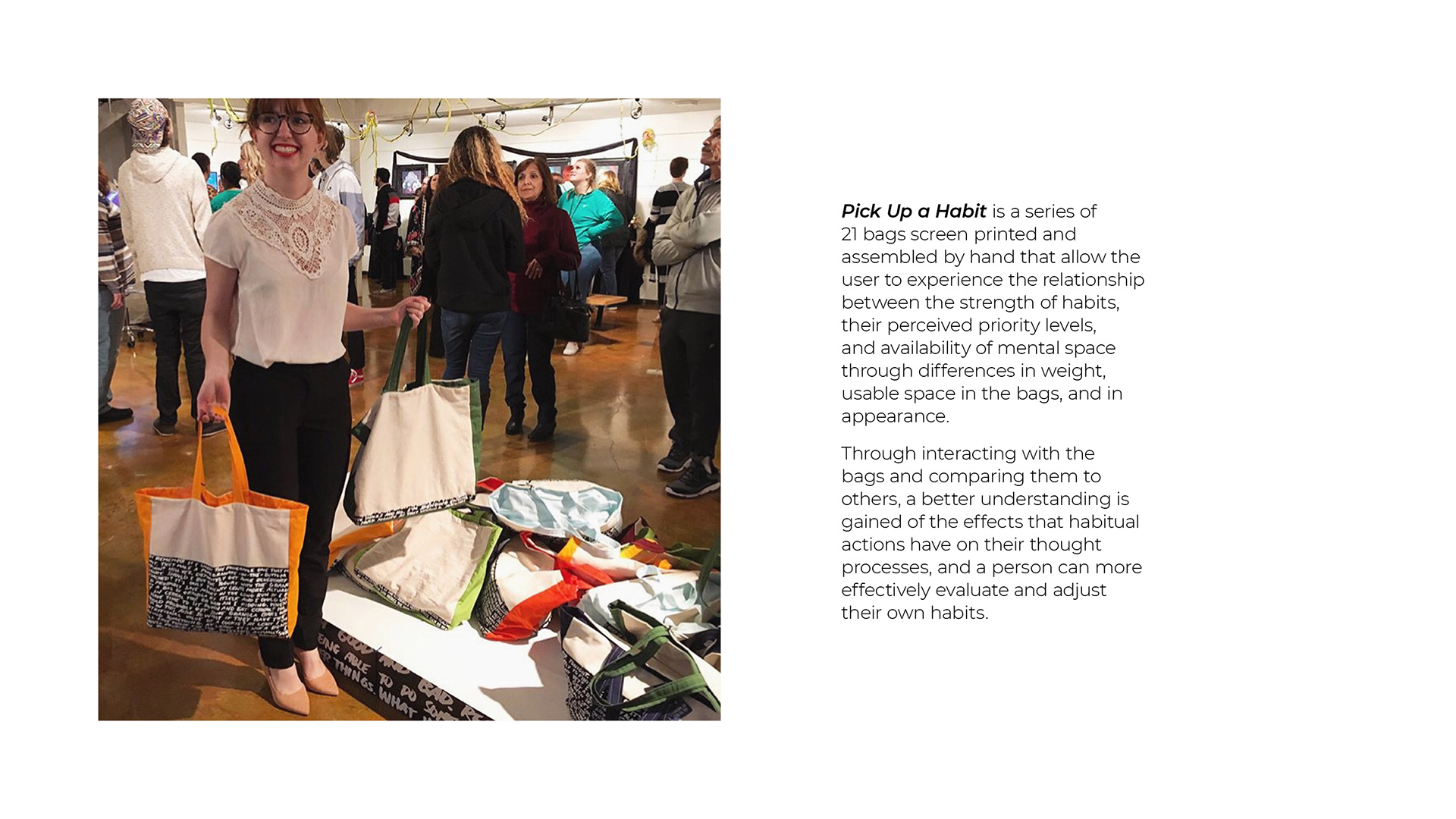 21 silk screened tote bags that illustrate the relationship between habit strength and mental capacity through changes in weight, available space, and outward appearance.